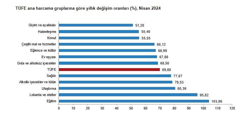 TÜFE’deki (2003=100) değişim 2024 yılı Nisan ayında bir önceki aya göre %3,18, bir önceki yılın Aralık ayına göre %18,72, bir önceki yılın aynı ayına göre %69,80 ve on iki aylık ortalamalara göre %59,64 olarak gerçekleşti.